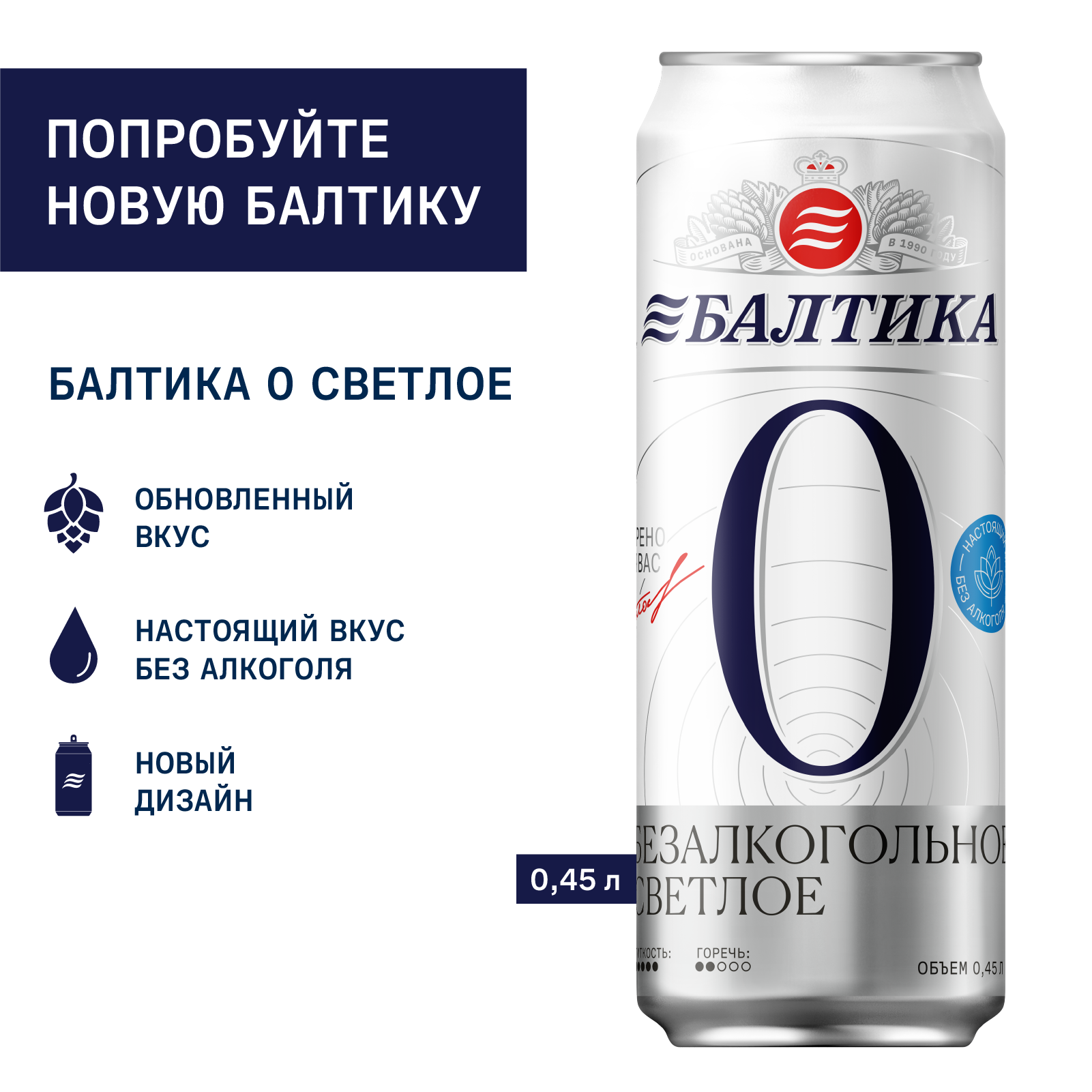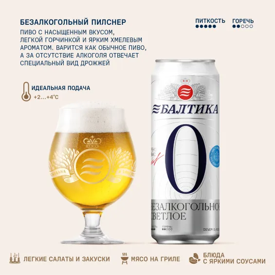 «Балтика №0» - это классический светлый лагер с насыщенным и освежающим солодово-хмелевым вкусом, подробнее«Балтика №0» - это классический светлый лагер с насыщенным и освежающим солодово-хмелевым вкусом, только без алкоголя. Для варки Балтики 0 используются особые дрожжи, которые позволяют повторить технологию варки обычного пива. «Балтика №0» содержит минералы и витамины В, А и Е, которые помогают восстановиться после физической и умственной активности. 100% солод. Содержит всего 30 ккал на 100 г.