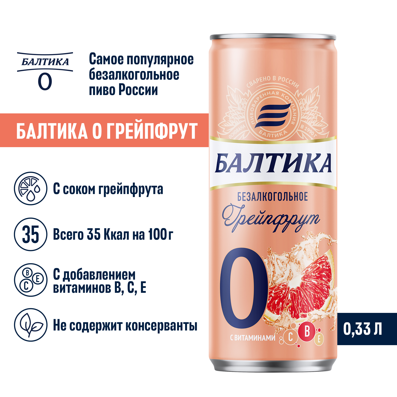 "Балтика №0 Безалкогольное Грейпфрут Банка 0,33 л – освежающий вкус грейпфрута без алкоголя!