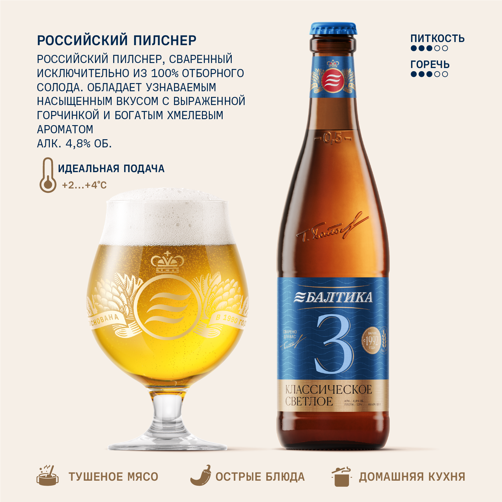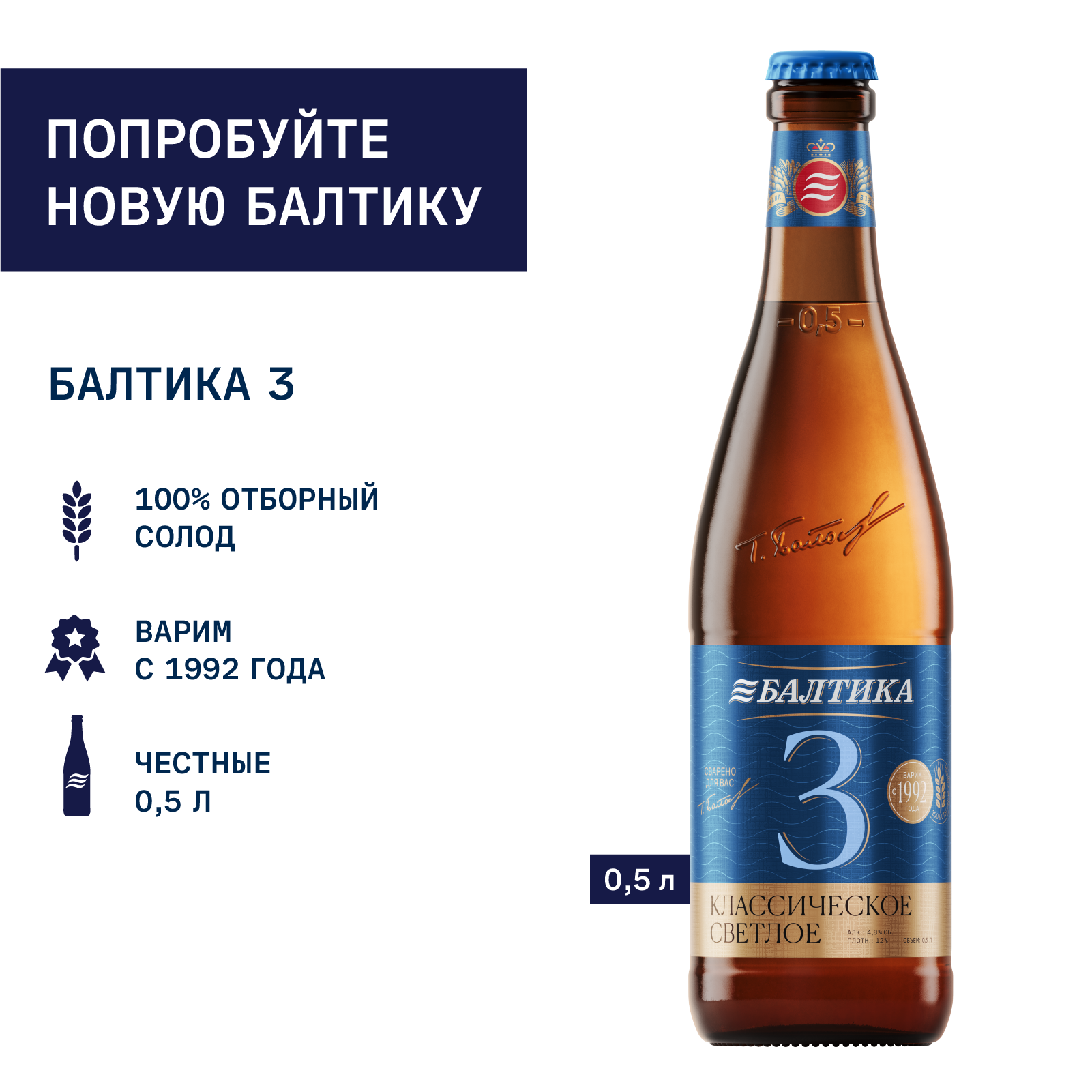 Балтика №3 — это классический светлый лагер, сваренный исключительно из 100% российского солода,