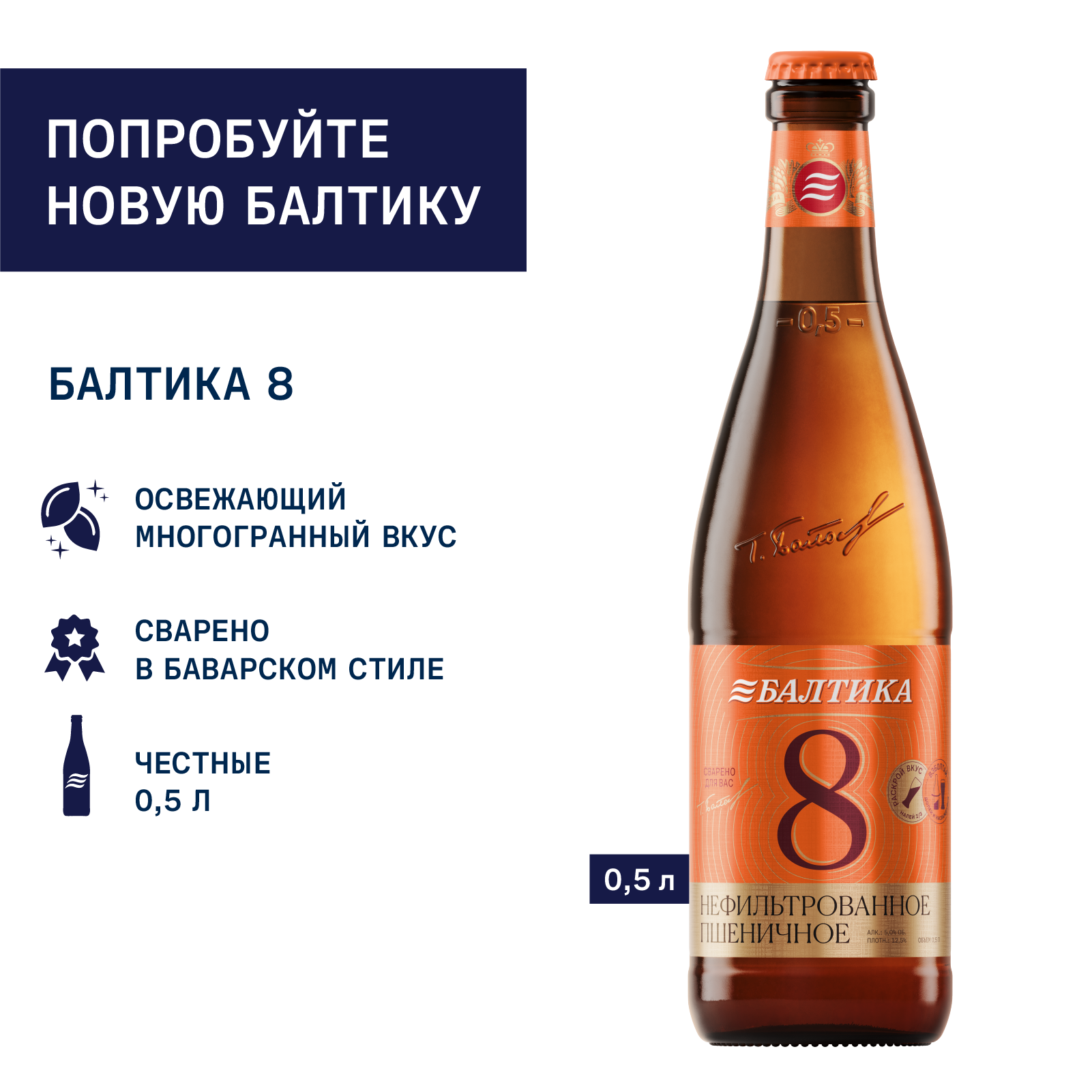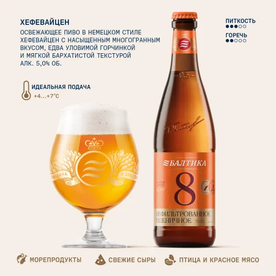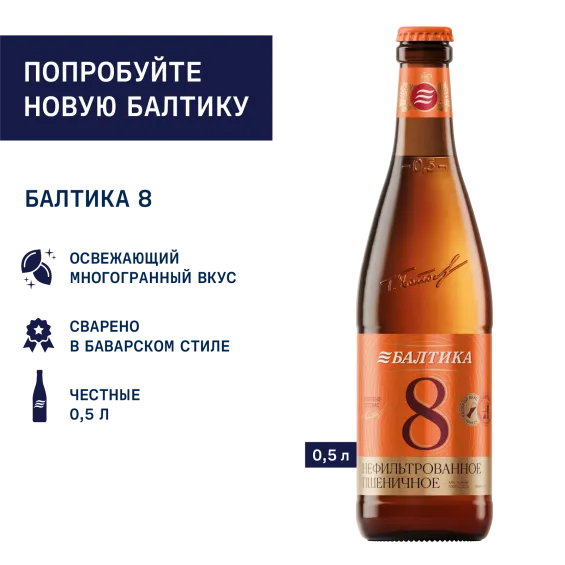Балтика 8 - это пшеничное нефильтрованное пиво с насыщенным многогранным вкусом, едва уловимой подробнееБалтика 8 - это пшеничное нефильтрованное пиво с насыщенным многогранным вкусом, едва уловимой горчинкой и мягкой бархатистой текстурой.