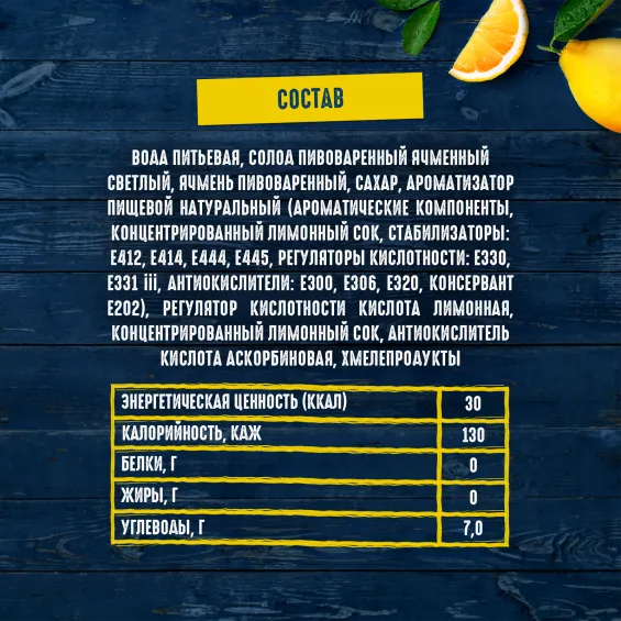 вода питьевая очищенная, солод пивоваренный ячменный светлый, ячмень пивоваренный, сахар, ароматизатор пищевой натуральный (ароматические компоненты, концентрированный лимонный сок, стабилизаторы: Е412, Е414, Е444, Е445, регуляторы кислотности: Е330, Е331iii, антиокислители: Е300, Е306, Е320, консервант Е202), регулятор кислотности кислота лимонная, концентрированный лимонный сок, антиокислитель кислота аскорбиновая, хмелепродукты
